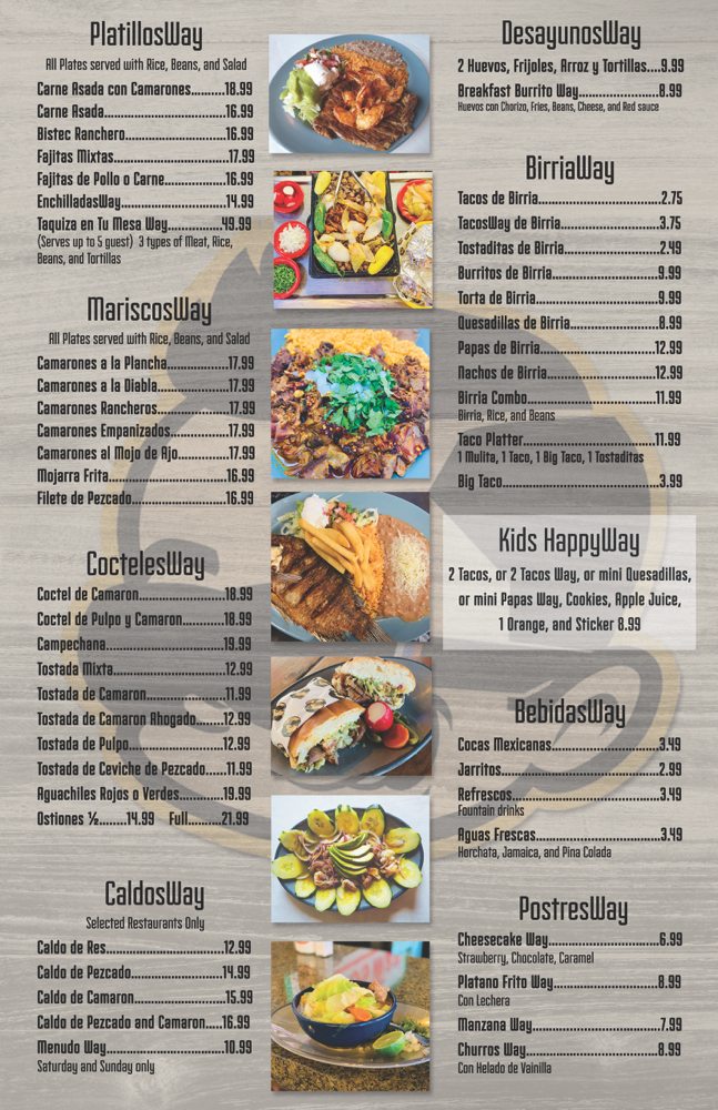 PapasWay or NachosWay, 6 street tacos, 3 TacosWay, 3 GringaWay. Menu favorites.